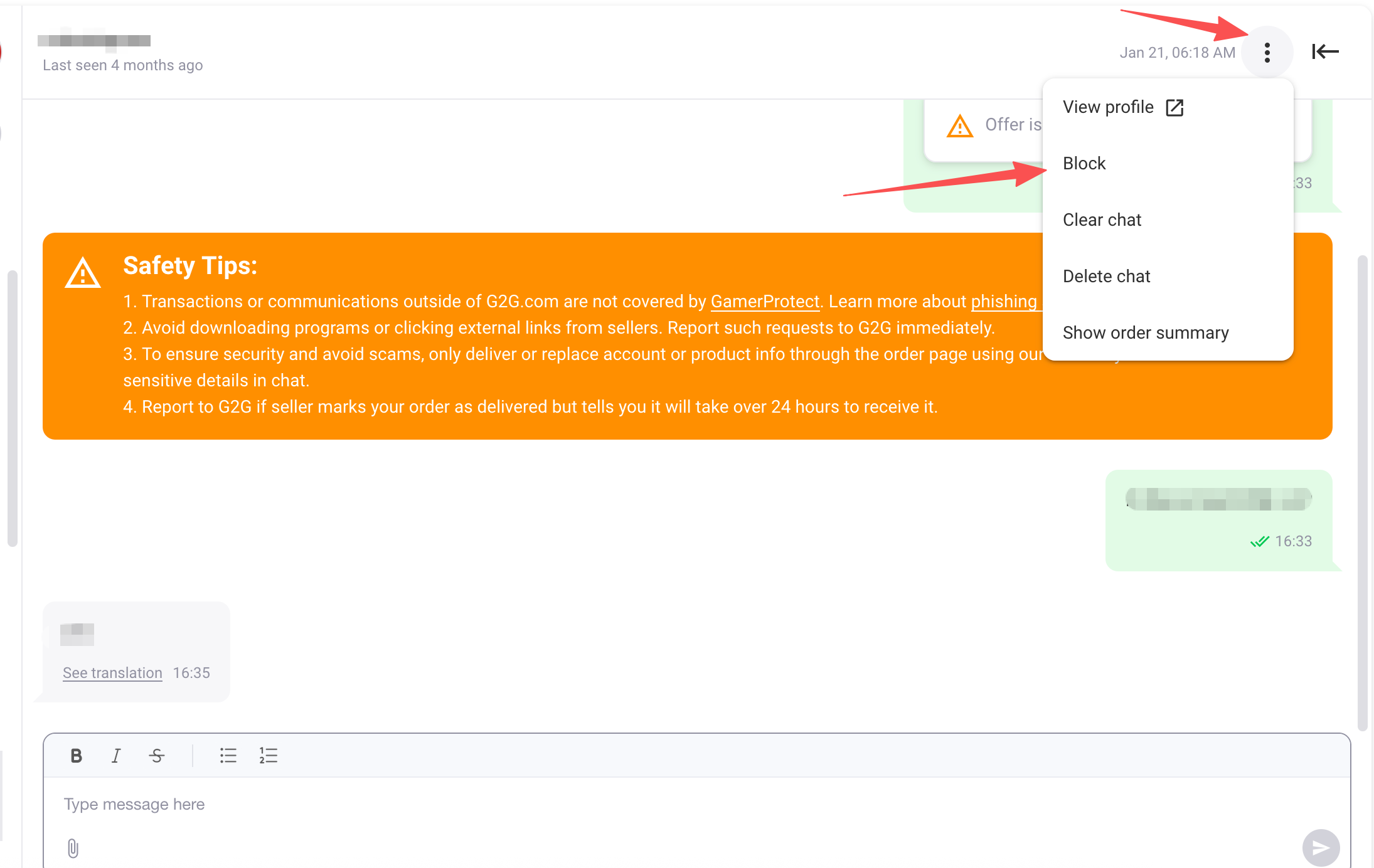 - 点击Block按钮后,您可以选择举报对方并选择原因。当您提交后,G2G会收到相应的通知并会介入调查。