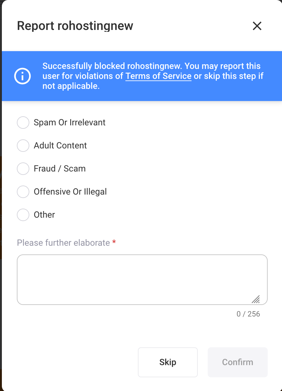 - 如果您只是单纯的希望将对方拉黑,您可以选择“Skip”按钮跳过举报步骤